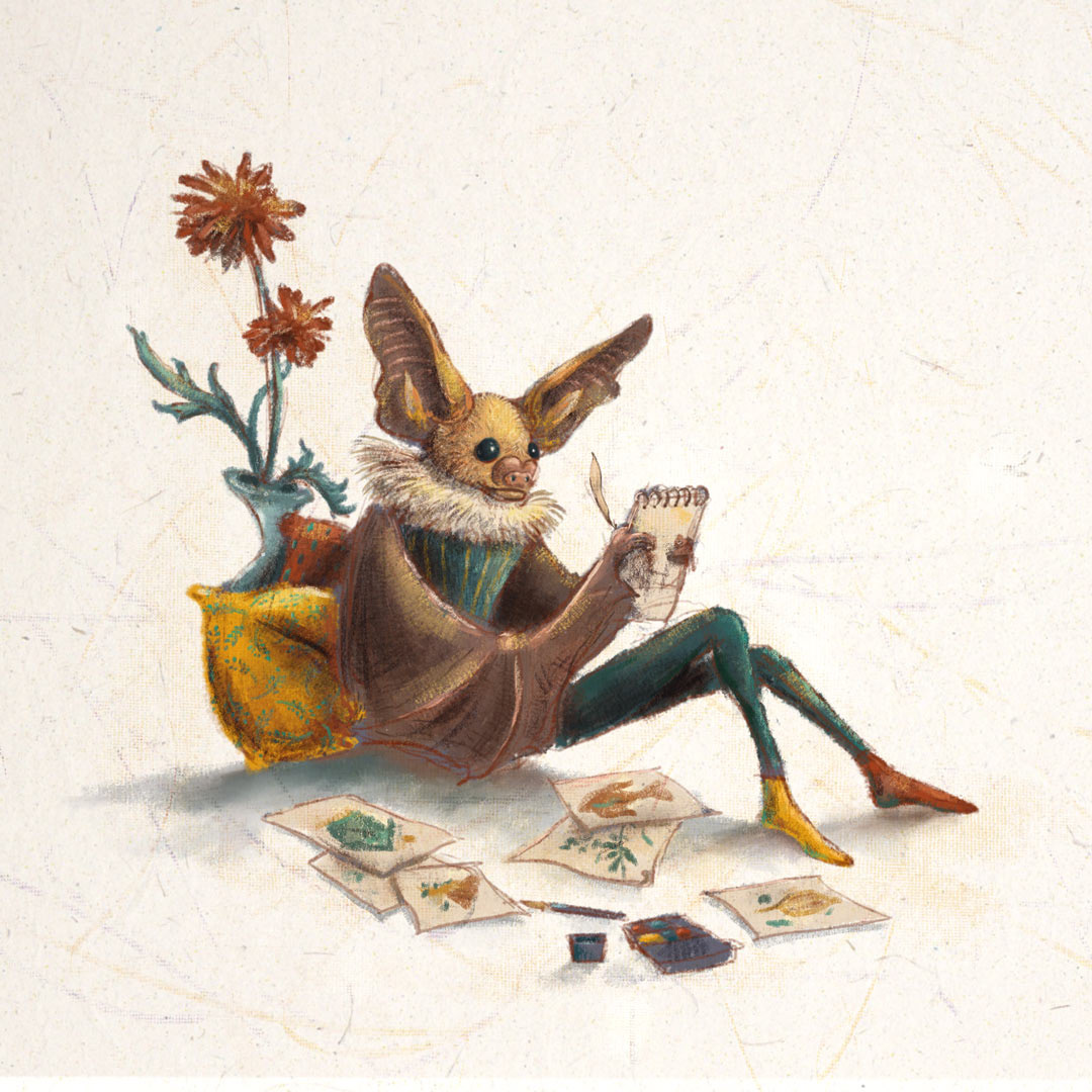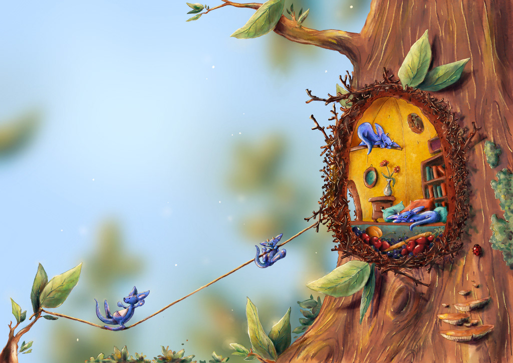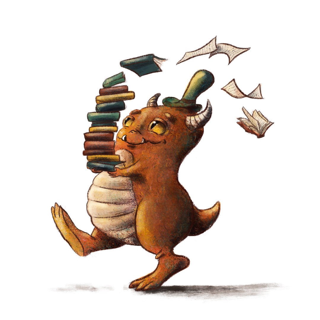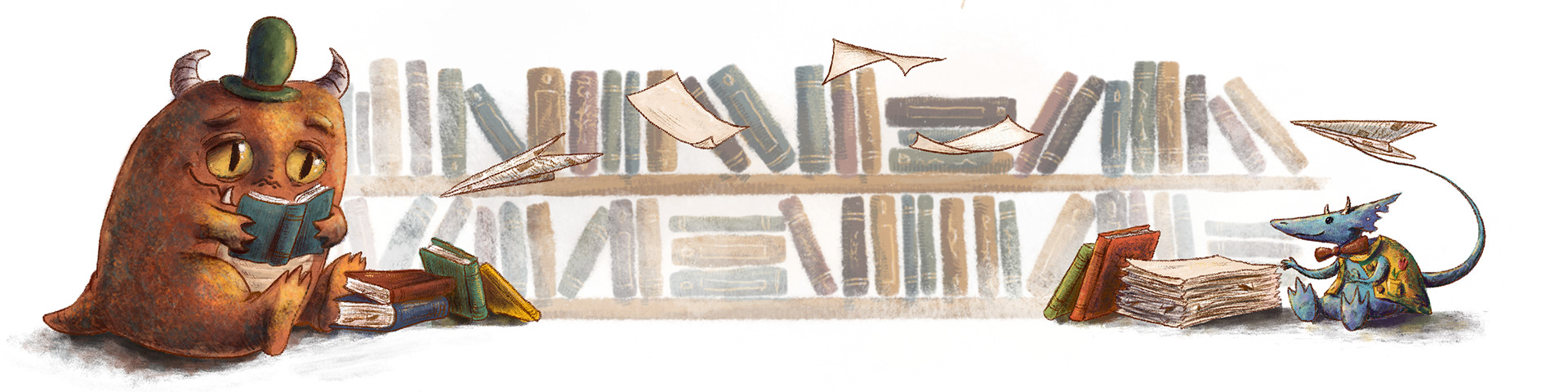 Digital illustrations and character designs of a group of creatures living in the forest and enjoying good books.